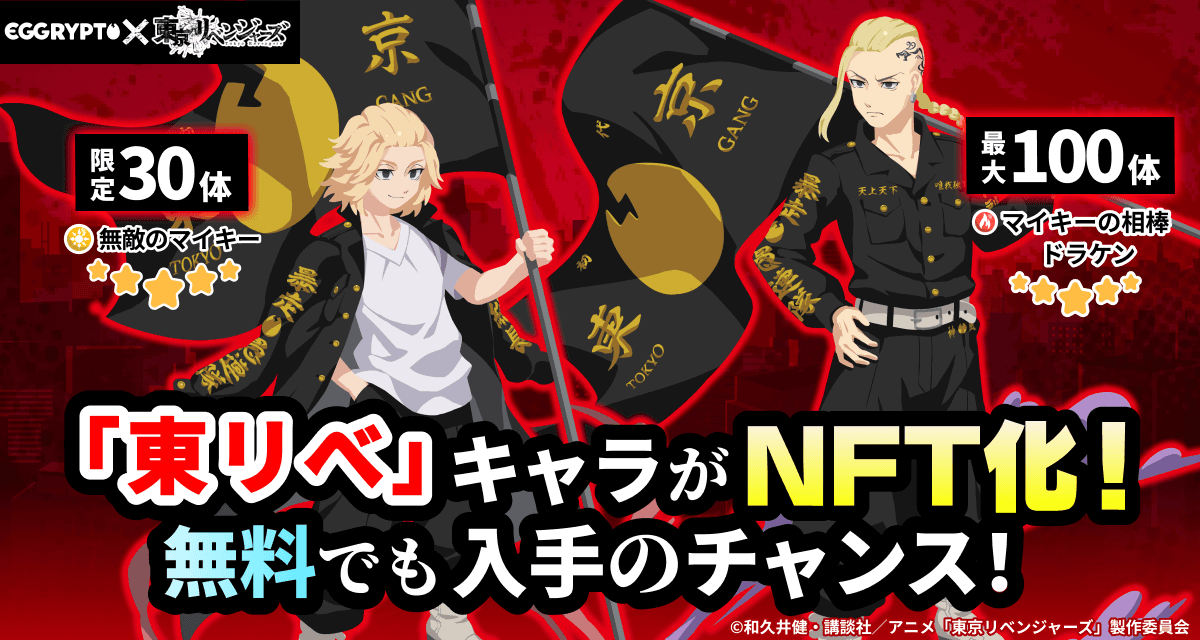 株式会社Kyuzan(本社:東京都渋谷区、代表取締役:髙橋 卓巳、以下「Kyuzan」)が、株式会社GameWith(本社:東京都港区、代表取締役社長:今泉卓也、以下「GameWith」)と共同開発した、アプリで簡単に遊べるNFTゲーム「EGGRYPTO(エグリプト)」において、『東京リベンジャーズ』とのコラボイベントを2月13日(金)12時より開催いたします。